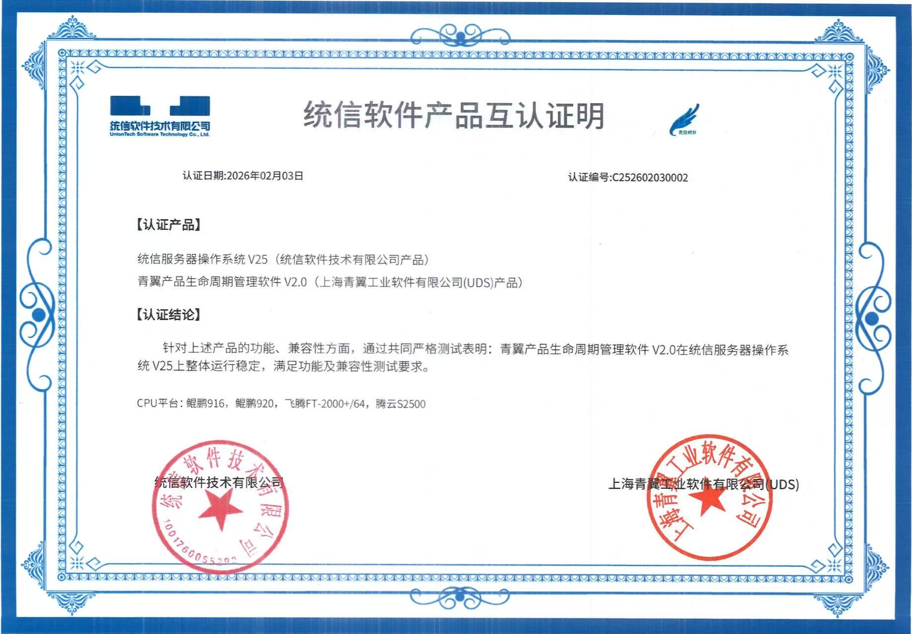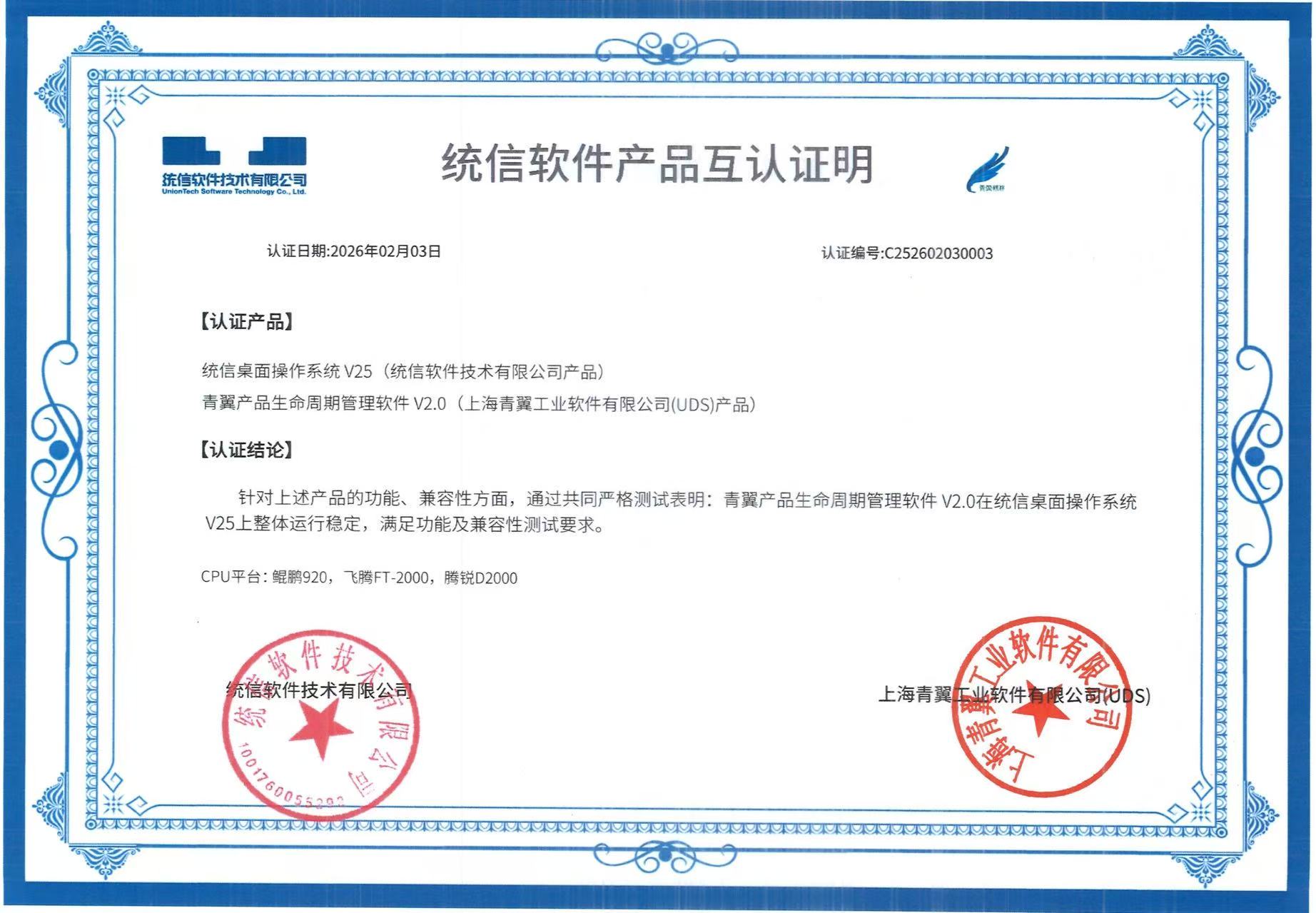 近日,上海青翼工业软件自主研发的青翼产品生命周期管理软件2.0(青翼PLM 2.0)成功完成与统信操作系统V25的多平台适配互认。经双方严格测试,青翼PLM 2.0在统信服务器操作系统V25(服务器版/桌面版)上整体运行稳定,满足功能及兼容性测试要求,获得了产品互认证明。
