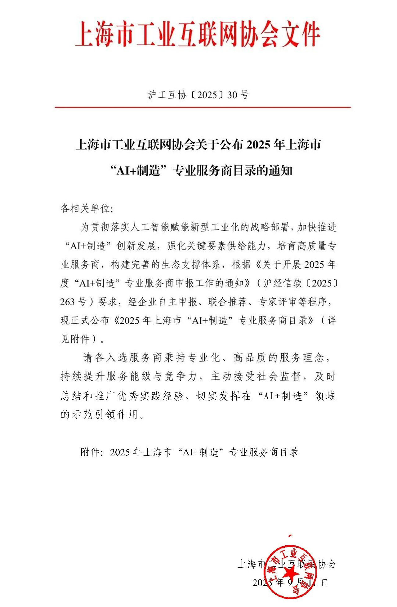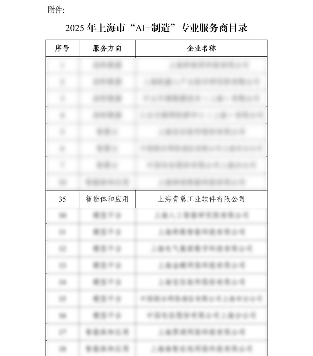 近日,上海市经济和信息化委员会正式公布《2025年"AI+制造"专业服务商》名录,经过自主申报、联合推荐、专家评审等程序,上海青翼工业软件(下称“青翼”)凭借在AI+领域持续的技术创新和成功的落地实践入选该名录。