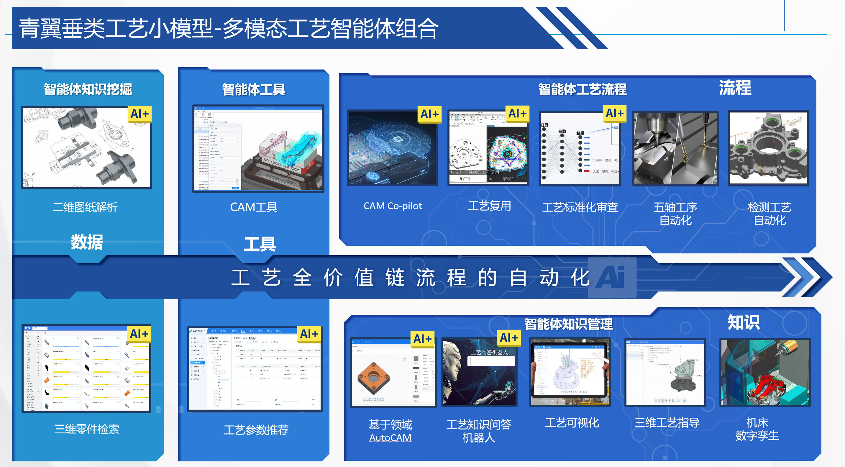 青翼工业软件完全自主研发的青翼CAM和青翼多模态工艺智能体组合,已经在部分垂直领域获得应用。青翼工艺智能体以多模态工程语言为驱动,实现工艺知识的提取,复用和迭代,实现工艺全价值链流程的自动化。已经发布的智能体包括二维图纸识别、三维几何相似性检索、工步级工艺参数推荐、CAM Co-pilot、工艺复用、工艺标准化审查,以及即将发布的基于垂直领域的AutoCAM和工艺知识问答机器人等,帮助国内的相关制造业企业解决效率瓶颈,实现生产力的跨越式提升。